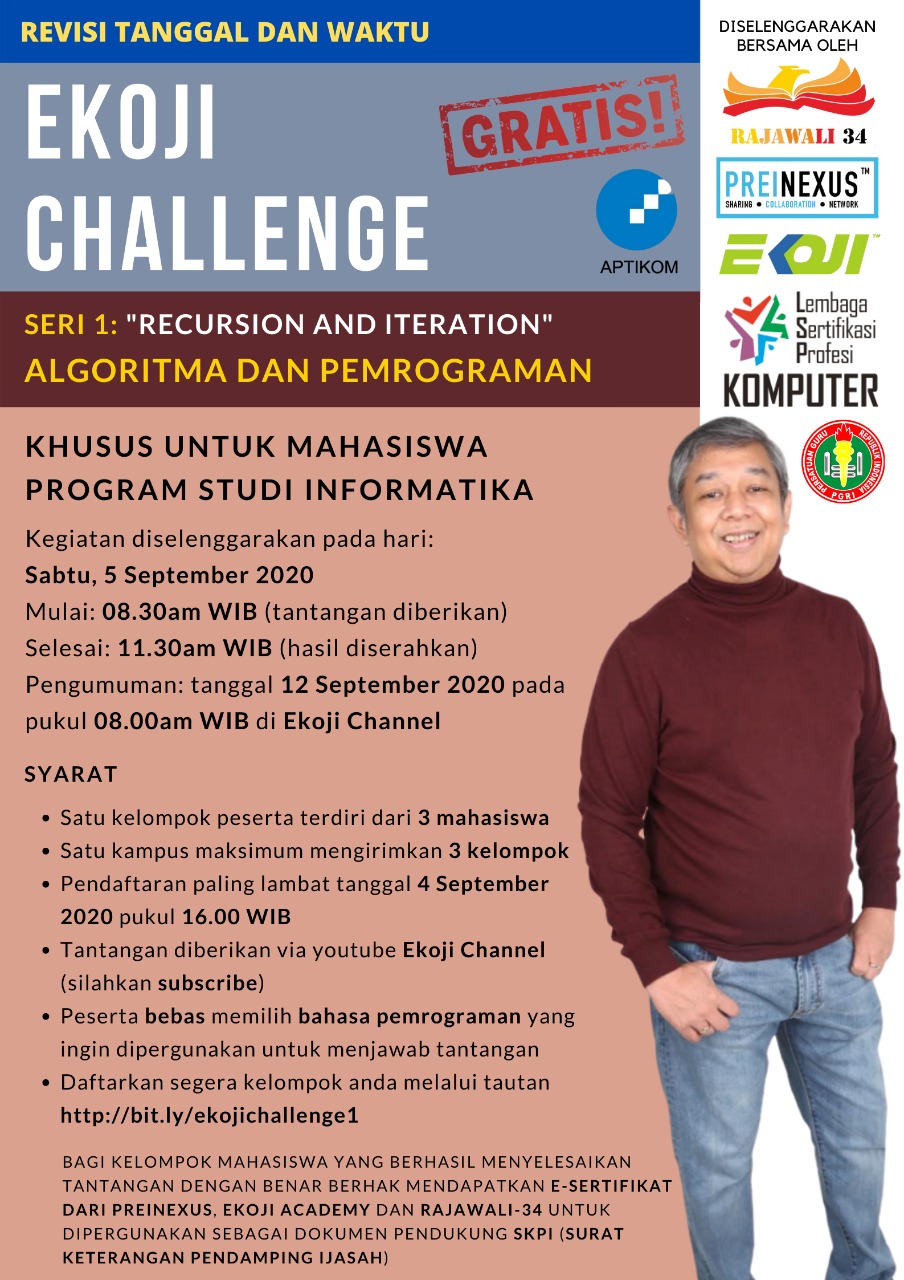 Assalamualaikum, apakabar rekan-rekan mahasiswa Teknologi Informasi. Kami sampaikan ada event menarik dari pada kamu gabut. Ekoji Challenge mengadakan tantangan dengan tema “Recursion and Iteration“. Topik ini masuk pada bidang Algoritma dan Pemrograman dan manfaatkan event tersebut sebaik-baiknya.
